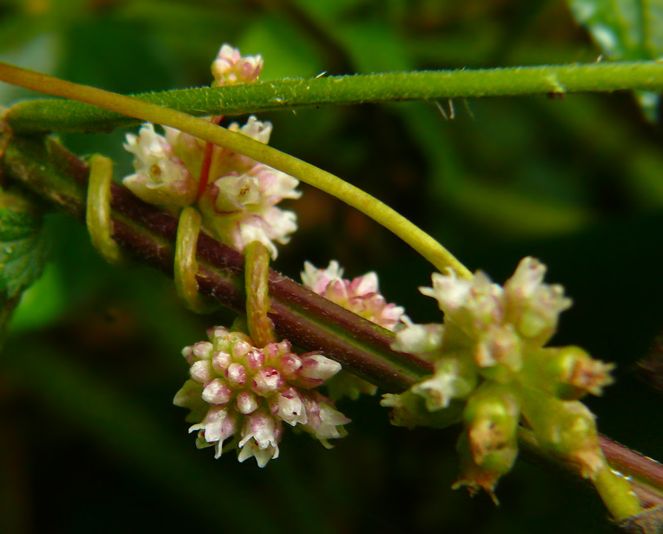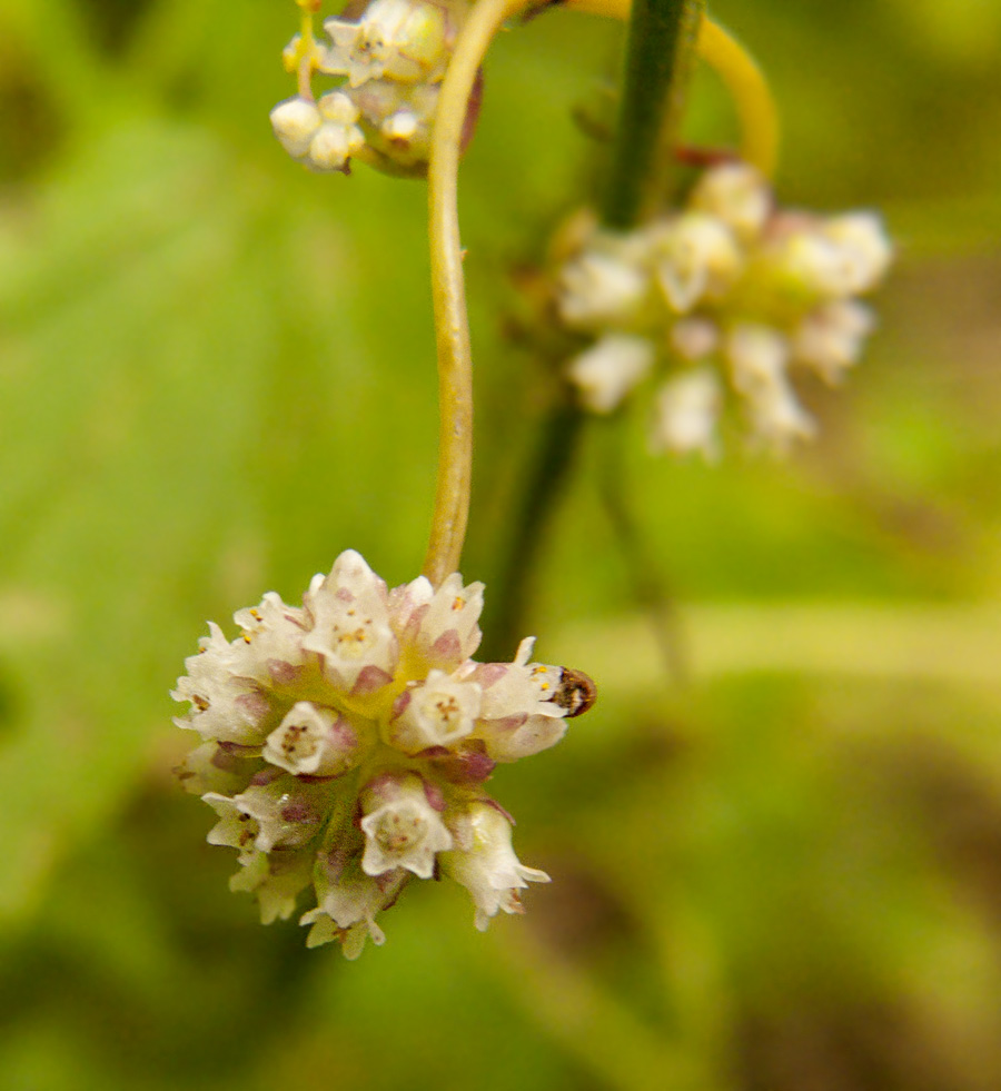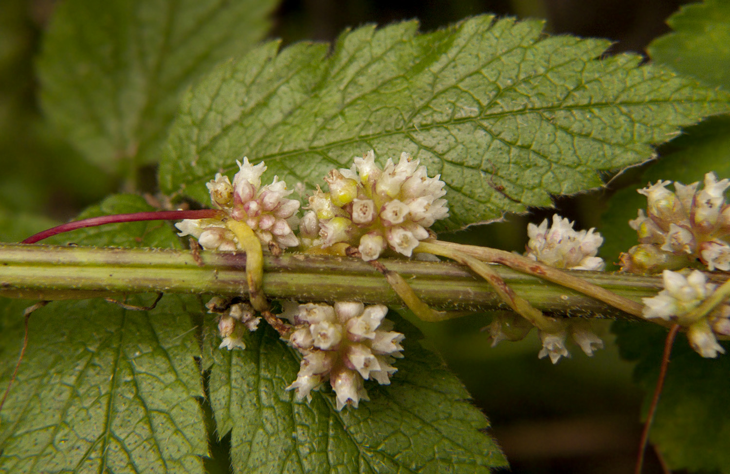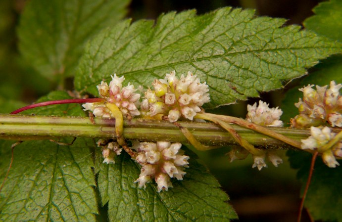 Wracając do kanianki – no właśnie, jest pasożytem. Praktycznie nie wytwarza liści, a już na pewno nie z pobudek praktycznych, raczej sentymentalnych ;) – są zredukowane do bezzieleniowych łusek, niezdolnych do asymilacji, korzeń zamiera niedługo po dotarciu do żywiciela, zaś łodyga służy tylko do wspinania się na inne rośliny, przysysania do nich i wykształcania kwiatów. Moja Cuscuta europaea żerowała na pokrzywie.