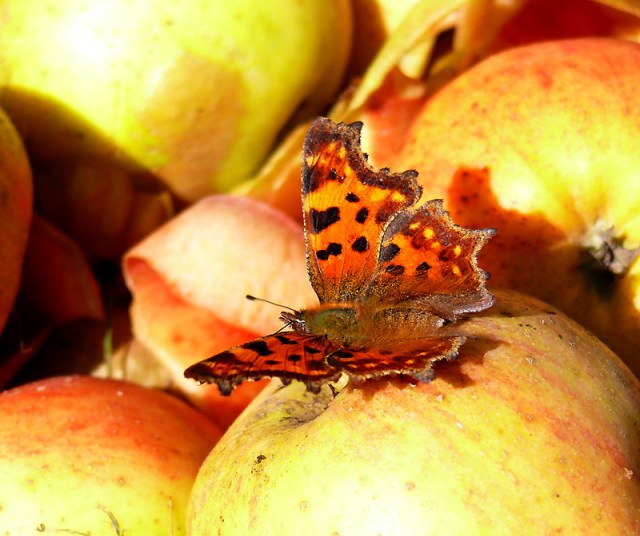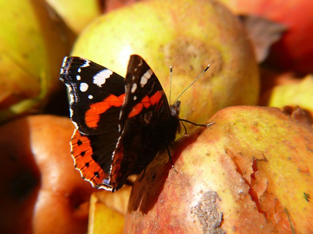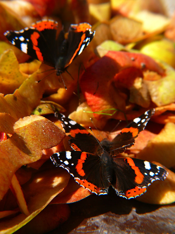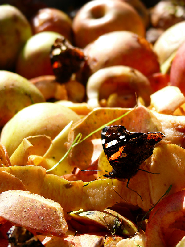 Październik, słoneczne, niedzielne popołudnie. W kuchni praca wre, przerabiamy z Mamą kilogramy jabłek, które już opadły z drzewa. Niektóre z nich ukryły się w trawie i zgniły, inne zbyt mocno się obiły – one lądują od razu w taczce, postawionej na łące pod jabłonią; te które można zjeść wkładam do wiadra i niosę do domu. Chwilę później idę po kolejną partię jabłek, w wiadrze niosę obierki które wrzucam do taczki, przecież i tak cała zawartość znajdzie się w kompostowniku, nie ma co nadrabiać drogi. Zbieram jabłka i uśmiecham się do pojedynczego admirała szybującego w okolicach zgniłych jabłek, Słoneczko pięknie grzało, a łąka pod jabłonką jest otoczona drzewami i jest tam zawsze ciepła kotlinka chroniona przed wiatrem. Świetne warunki na ostatnie loty. Przy kolejnym zbieraniu naliczyłam 8 admirałów i jedną rusałkę ceik, pożywiających się na obierkach. Następnym razem przyszłam z aparatem. :)