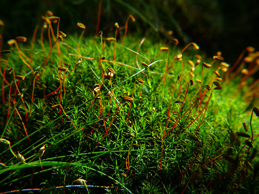 Trafiło się nam, że przechodząc leśną ścieżką obok skarpy Słońce na nieboskłonie było akurat w takim miejscu, by pięknie oświetlić  mech na tejże skarpie i stworzyć mikroświat (pieśń nawet wtedy powstała na ten temat, niestety nie została zachowana dla potomnych, choć może to i lepiej…). Skwapliwie skorzystałam z tego, że obiekt był na pochyłości dość wysoko i nawet nie trzeba było się schylać. Lubię mchy, choć nie lubię ich oznaczania – pewnie przez brak barwnych kwiatów ;), ten jednak, jak mniemam, oznaczyłam dobrze, to dość popularny gatunek. :)