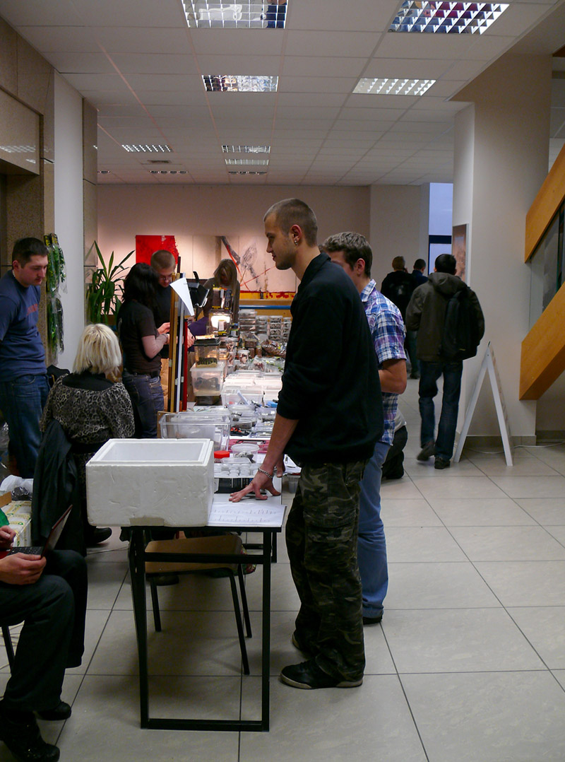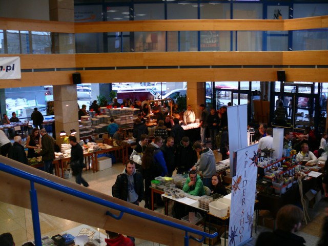 18 grudnia odbyła się na terenie holu Centrum Naukowo-Dydaktycznego UP we Wrocławiu już po raz drugi giełda terrarystyczna. Niestety nie jestem w stanie powiedzieć nic o pierwszej edycji, nie było mnie wtedy we Wrocławiu – pewnie jakieś ważne sprawy, bo łatwo bym sobie nie odpuściła ;) Teraz nadrobiłam i przyznam, że trochę się obawiałam, ale impreza jest całkiem spora, większa, niż się spodziewałam. Wchodziło się, niestety, nie przez wejście główne gdzie na drzwiach wisiała kartka ze strzałką i napisem „Wejście obok”, a przez boczne, po czym trzeba było udać się na I piętro i dopiero tam usytuowana była akredytacja (potem okazało się, że przy głównym wejściu też wpuszczani są ludzie, ale nie dam głowy, że nie byli to wystawcy którzy mieli w pobliżu samochody). Wejście na giełdę to 4 zł.