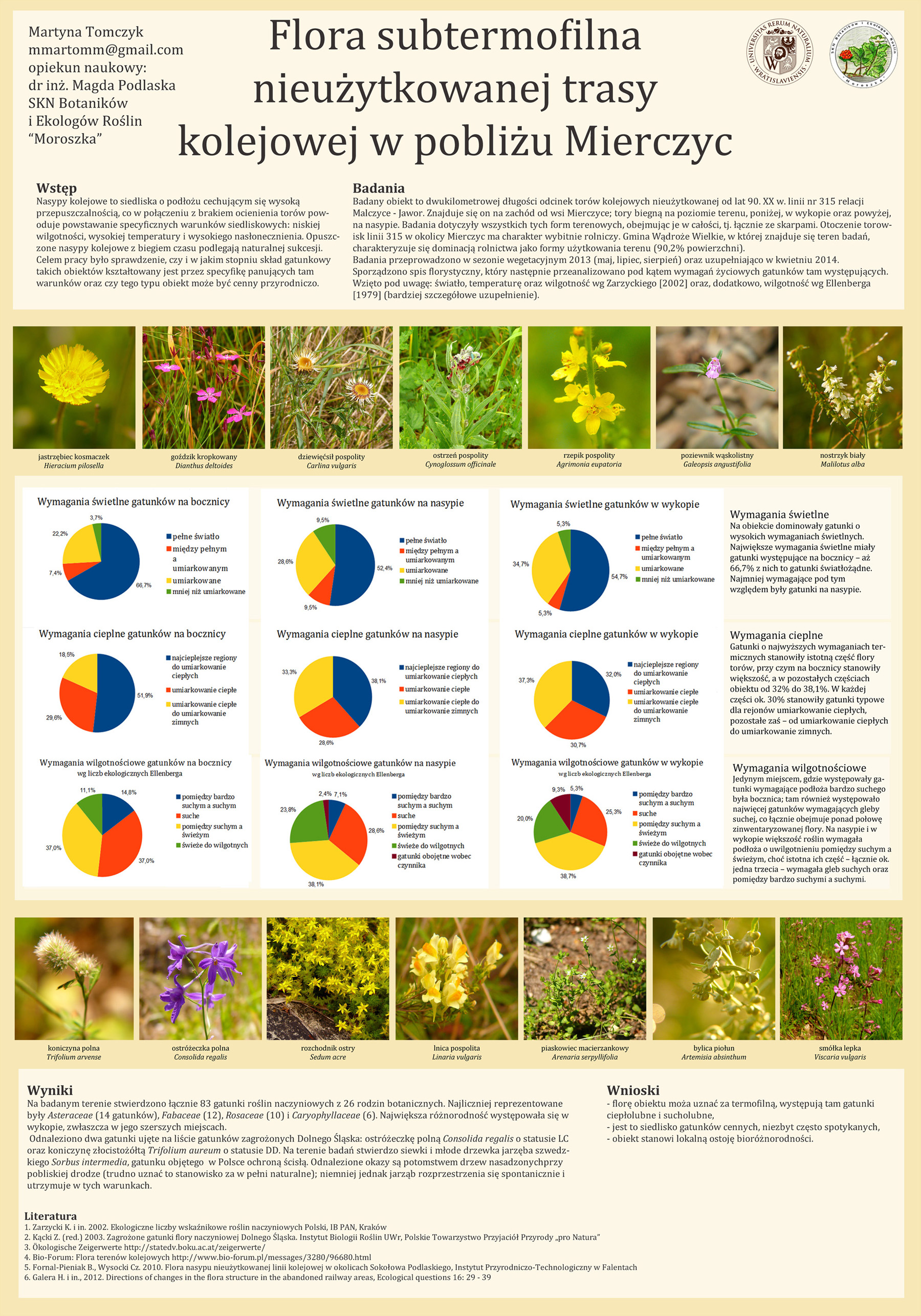 Zaczęło się od tego, że zajrzałam do inwentaryzacji przyrodniczej gminy okolic domu rodzinnego; inwentaryzacja wspominała o kilku cennych przyrodniczo obiektach w gminie, w tym – o opuszczonym nasypie kolejowym jako miejscu występowania lokalnie rzadkiego gatunku jakim jest smółka lepka. Nasyp mam po sąsiedzku więc w wolnej chwili zajrzałam tam, znalazła się smółka i całkiem sporo innych dość ciekawych gatunków, zwłaszcza ciepłolubnych. Na pewno kojarzycie, że na torowiskach kolejowych czy nawet tramwajowych (tych nielicznych, których nie zlewają Roundupem) często występują charakterystyczne gatunki – żółte dywaniki rozchodnika ostrego, różne dziewanny i wiesiołki czy niebieskie żmijowce. Wespół z opiekunką naukową sprawdziłyśmy, czy i na tych torach występują gatunki ciepłolubne. Zapraszam do zapoznania się z posterem (większy dostępny po kliknięciu) jeśli chcecie poznać wyniki badań :)