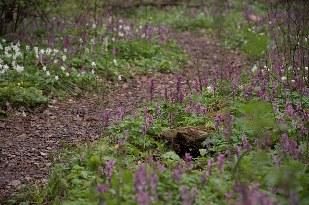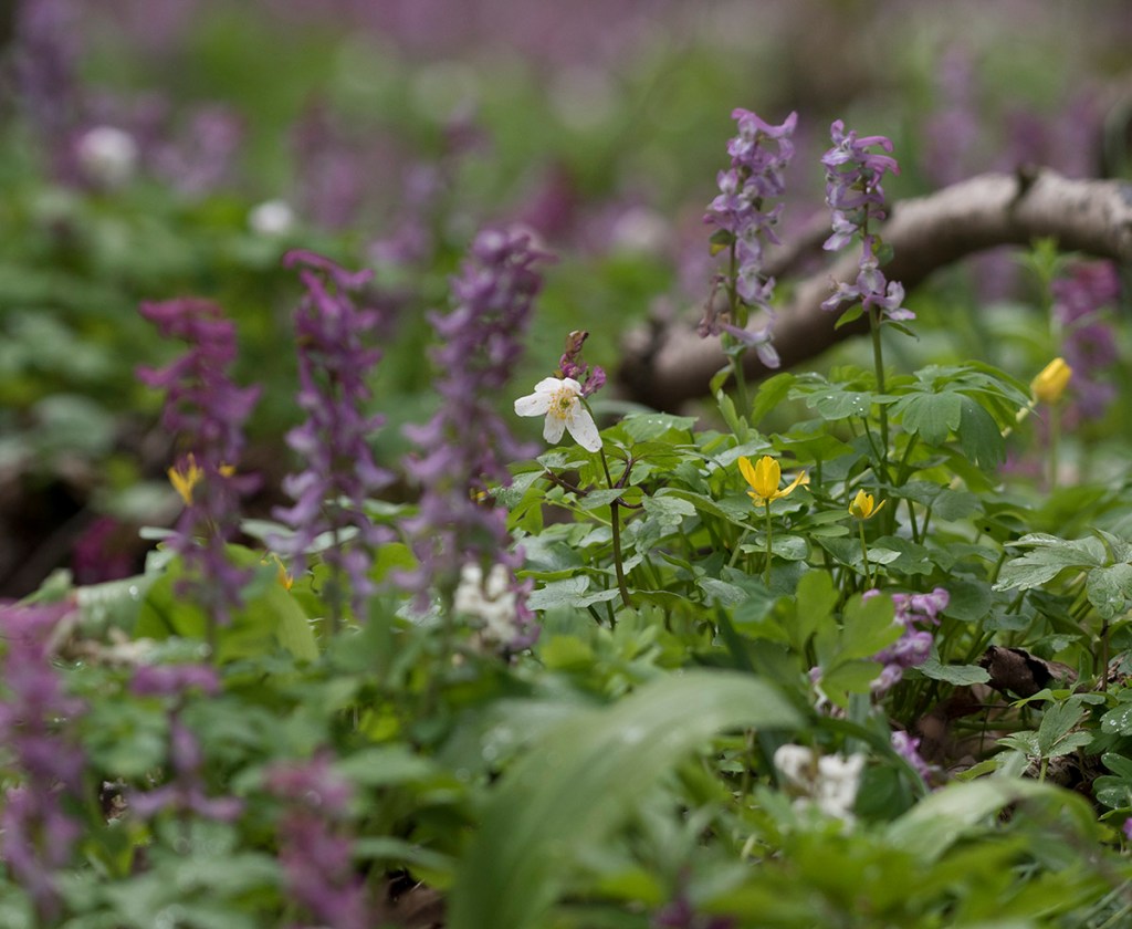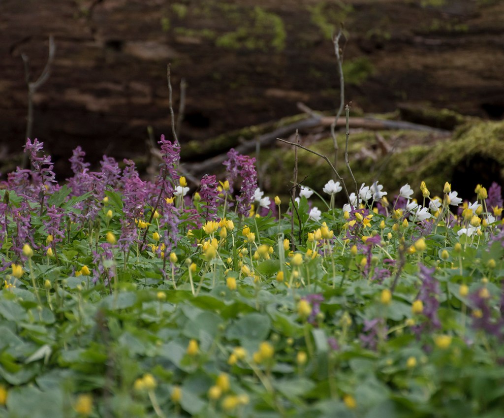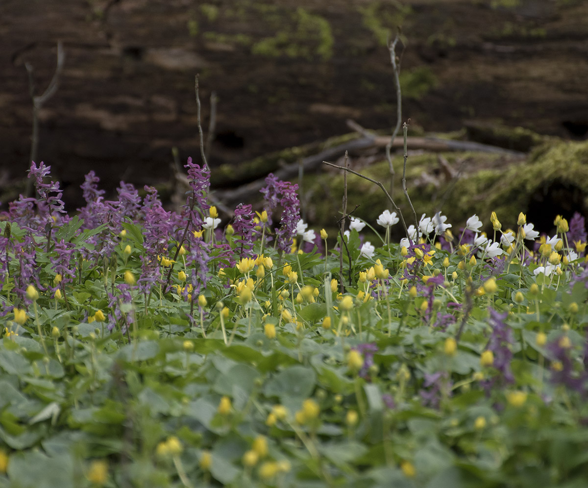 Kokorycz pusta (Corydalis cava), zawilec gajowy (Anemone nemorosa L.) i ziarnopłon wiosenny (Ficaria verna Huds.)