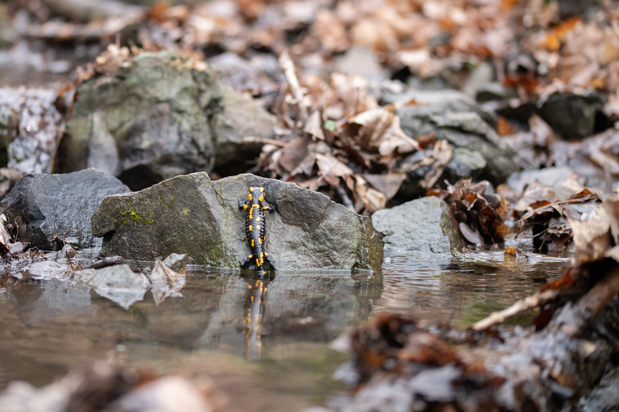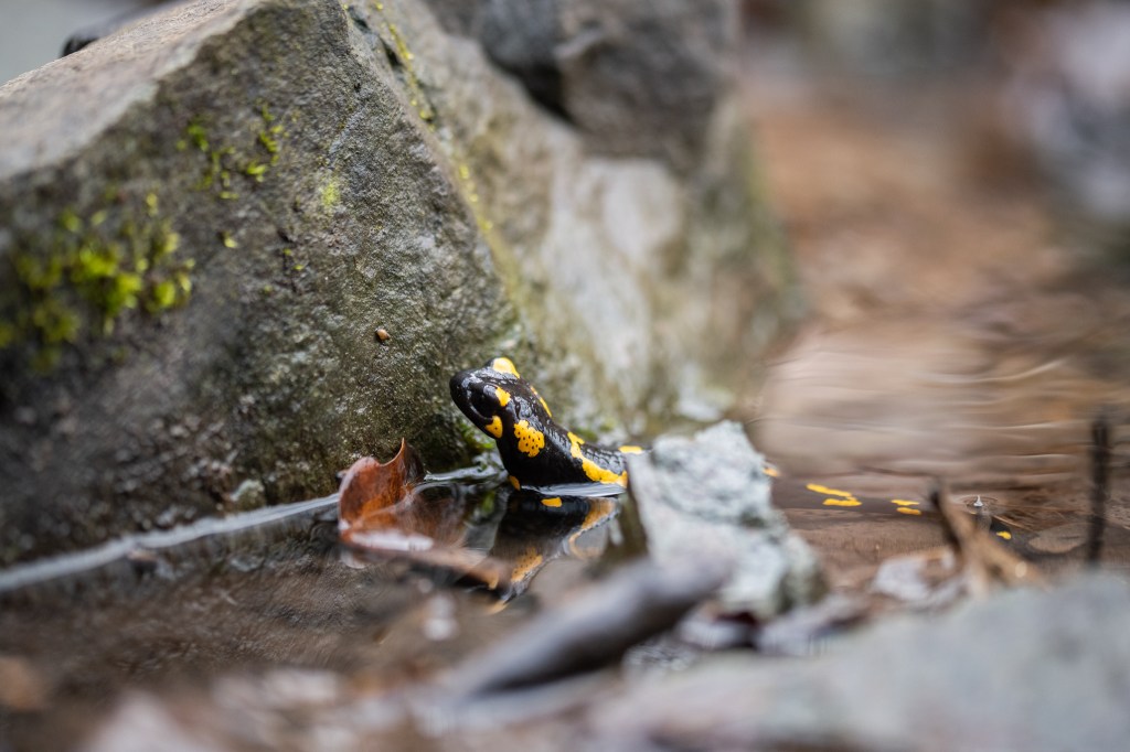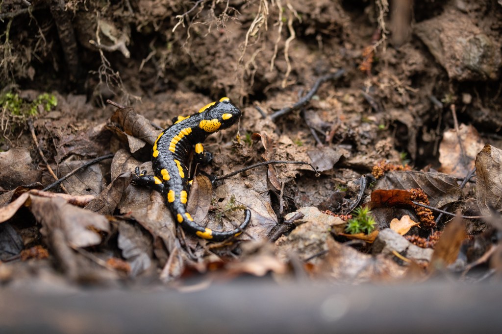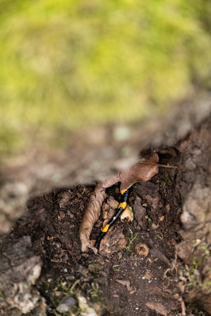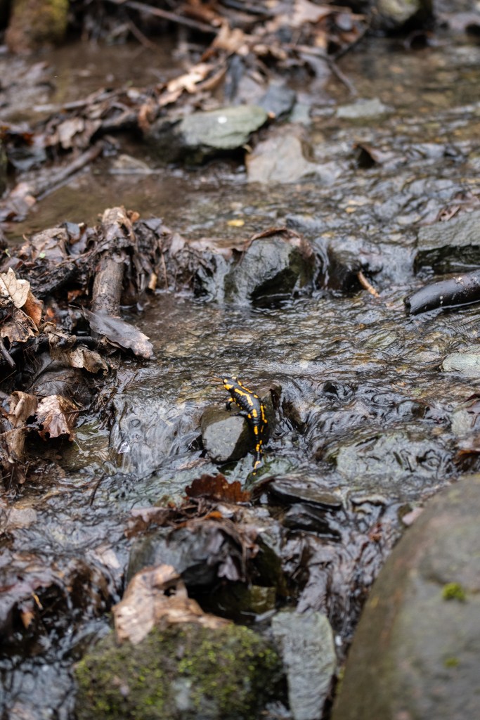 Dojechałam na miejsce godzinę po wschodzie słońca, zresztą słońce prędko schowało się za chmury. Pierwsza salamandra siedziała na środku. Druga jakieś 100 m dalej tuż obok ścieżki. Kolejne pojawiały się co chwila, w końcu przestałam liczyć, a jak już doszłam do strumienia to cały czas miałam conajmniej jedną w polu widzenia. Salamandrowe El Dorado!